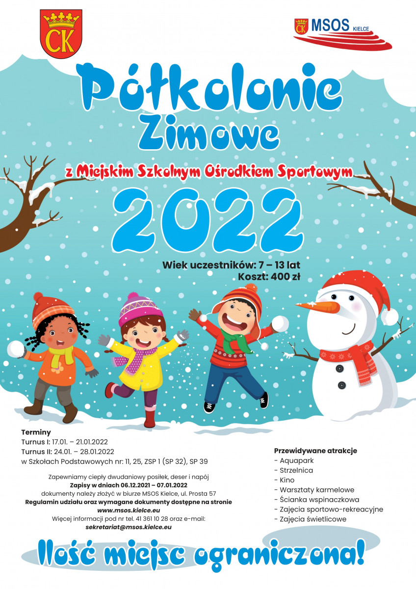 Miejski Szkolny Ośrodek Sportowy w Kielcach zaprasza dzieci w wieku 7-13 lat na Półkolonie Zimowe z MSOS Kielce 2022.